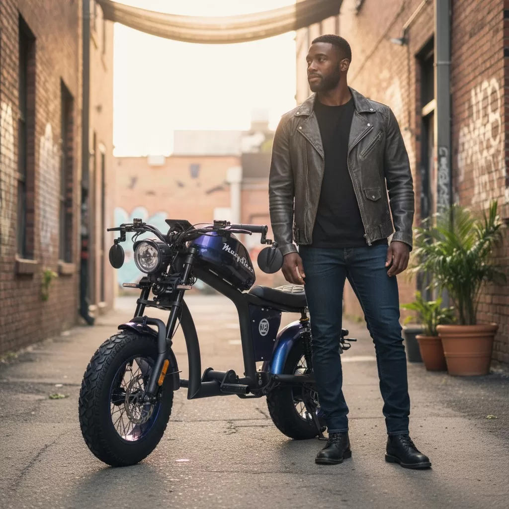 街の片隅で、革ジャンを羽織ったライダーとスタイリッシュな電動バイクが佇む──そんな一枚です。